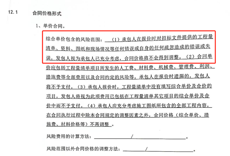 咨询内容: 我们在结算评审时遇到了合同约定的问题: 12.1合同价格形式 1、单价合同。 综合单价包含的风险范围:(1)承包人在报价时对招标文件提供的工程量清单、资料、图纸和现场情况等任何错误或自身的任何疏忽造成的错误或失误,发包人视为承包人已充分考虑,合同价格将不会得到调整。 请问:结算提报的工程量比原投标工程量清单的工程量增加了,是否能调整?