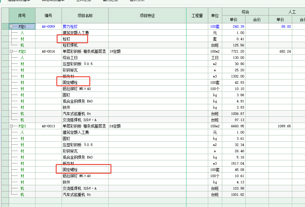 咨询内容: 老师好 在建筑定额中,单层彩钢板屋面定额中含中固定螺栓(19定额为A8-0016,24定额为A8-0013) 请问固定螺栓和剪力栓钉是同一种功能构件吗?